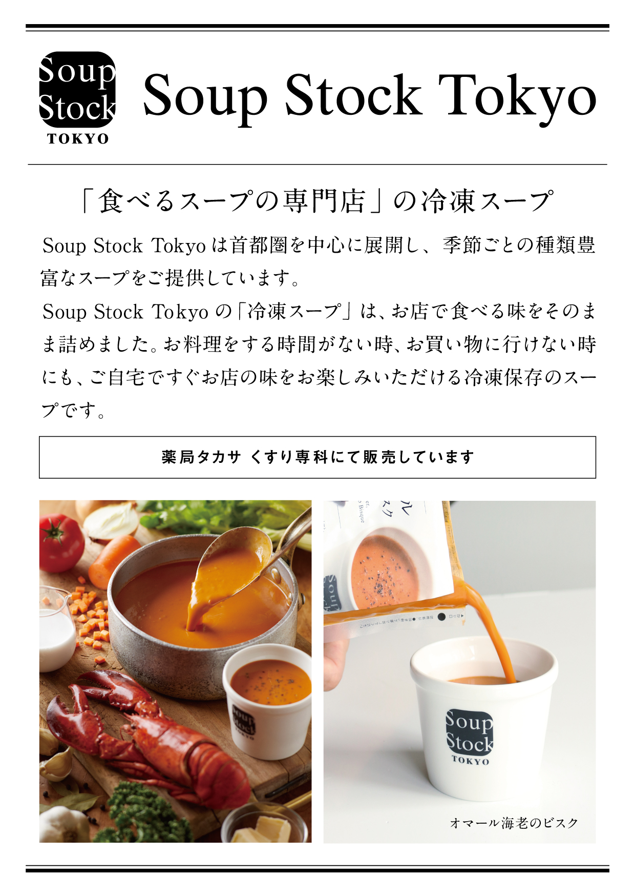 千葉県を中心に調剤薬局や介護事業を展開する株式会社タカサ。「医療産業の中にあり 、総合的に人と関わりを持ち、 安心して相談してもらえる場所であること」 を理念に掲げる同社では、 新たな取り組みとしてSoup Stock Tokyoの冷凍スープ販売を開始しました。