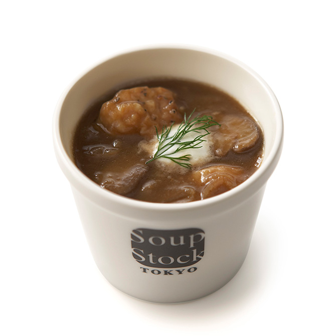 飴色に炒めたソテーオニオンの甘さとバルサミコ酢の旨味と香りがぎゅっと詰まった甘酸っぱいスープです。鶏肉ときのこのおいしさが口いっぱいに広がります。